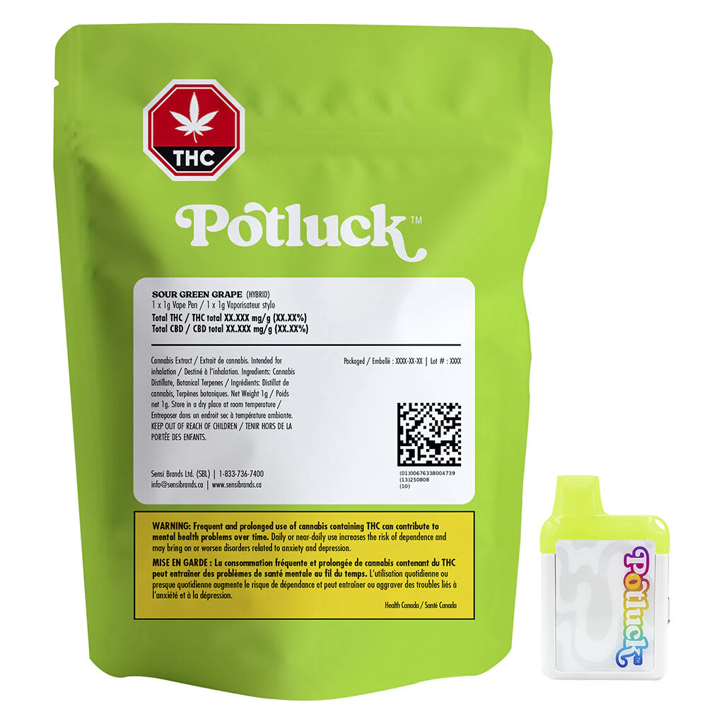 Our Sour Green Grape 1g disposable vape has a sour bite of flavours, mixing ripe green grapes and undertones of sweetness. Add a zesty and fresh experience for your tastebuds with a sweet and tangy aroma. Potluck's all-in-one disposable vape is powered by CCell, providing a reliable, flavourful, and portable product.